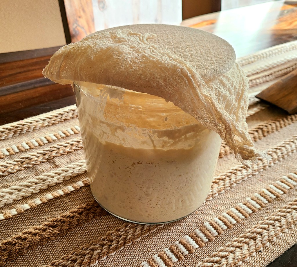 On day 3, use a plastic or glass measuring spoon or cup to remove 1 cup of the mixture, then add 1/2 cup wheat flour, 1/2 cup unbleached all purpose flour and 1 cup room temperature water. Stir, cover with a cloth and let sit to ferment.