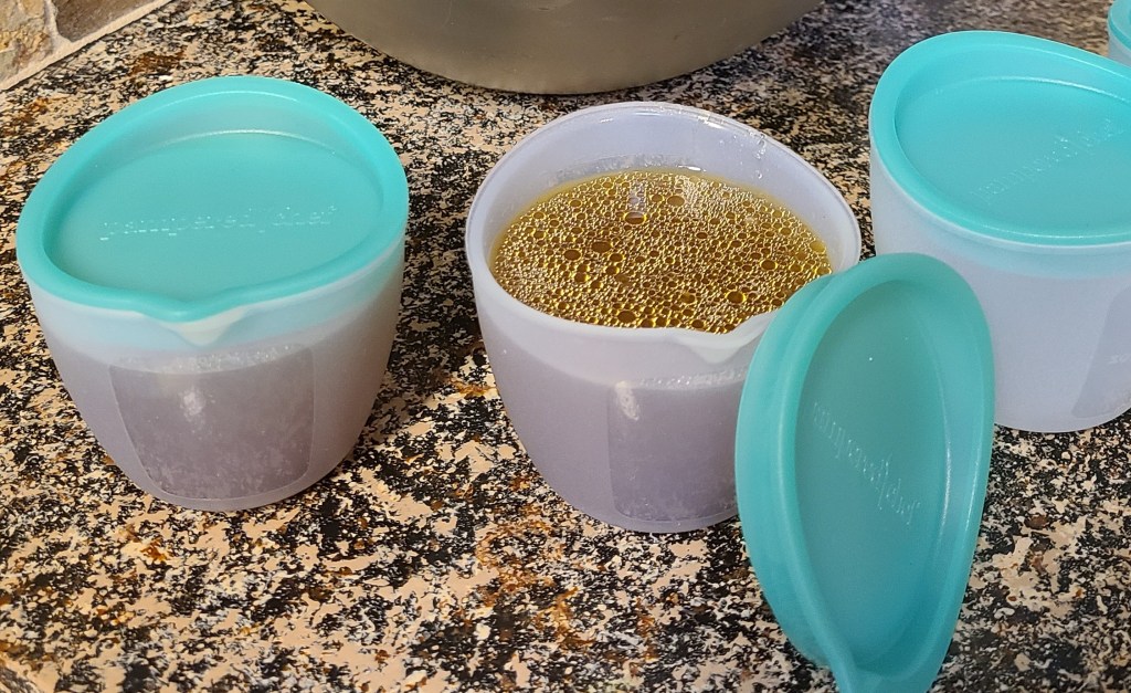 When you’re ready to use a frozen portion, either take it out of the freezer and let sit on the counter to defrost or add to 1/2 cup hot water and warm in a pot. If your recipe calls for 2 cups broth and you’ve saved your broth in 1/2 cup increments, take out 2 and add them to 1 cup water.