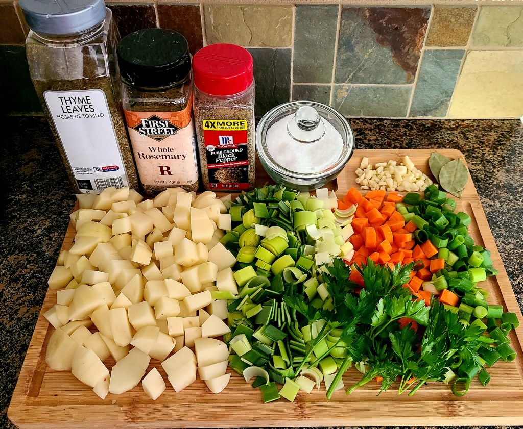Mince the garlic and cut the other veggies into bite size pieces. I made my soup with potatoes, since that’s what my hubs wanted.