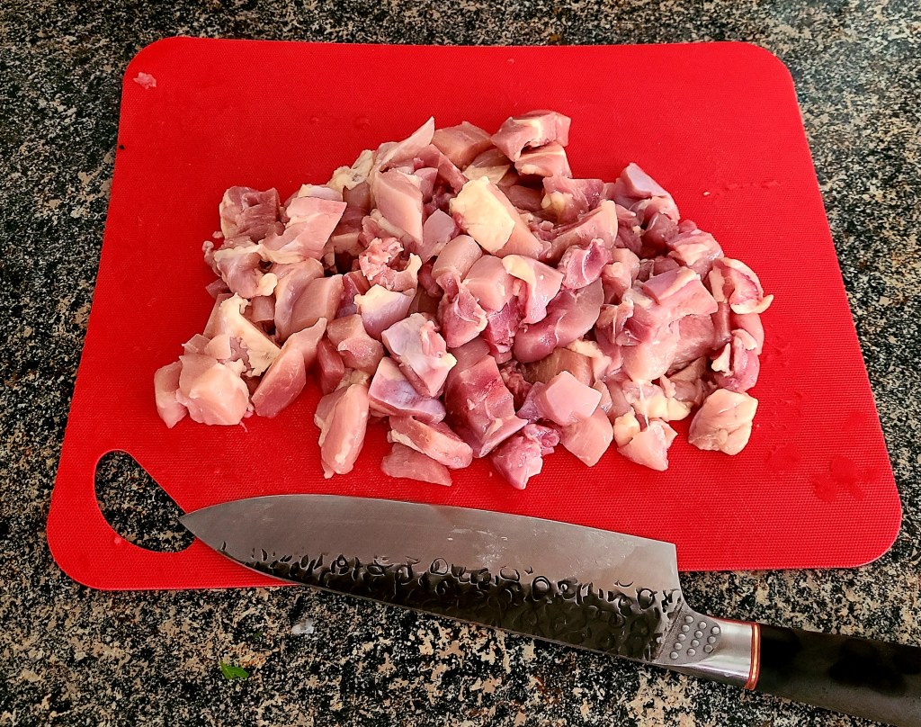 After chopping the vegetables, cut the chicken into bite size pieces and set aside.